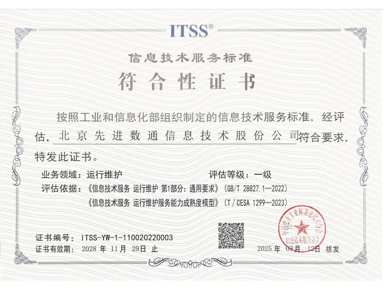 一竞技官网先后取得CMMIL5、软件能力成熟度五级(SPCA 5)、信息系统建设和服务能力评估体系(CS)5级、ITSS成熟度一级、信息系统安全集成服务资质二级、信息系统安全运维服务资质二级、国产化信息系统集成和服务能力评估四级(LS4)、北京市企业技术中心等资质认证,并取得ISO9001、ISO20000、ISO27001、ISO14001、ISO45001、ISO22301、ISO37001、ISO28001、GBT29490等标准体系认证,具备行业领先的技术开发、工程实施及服务保障能力。