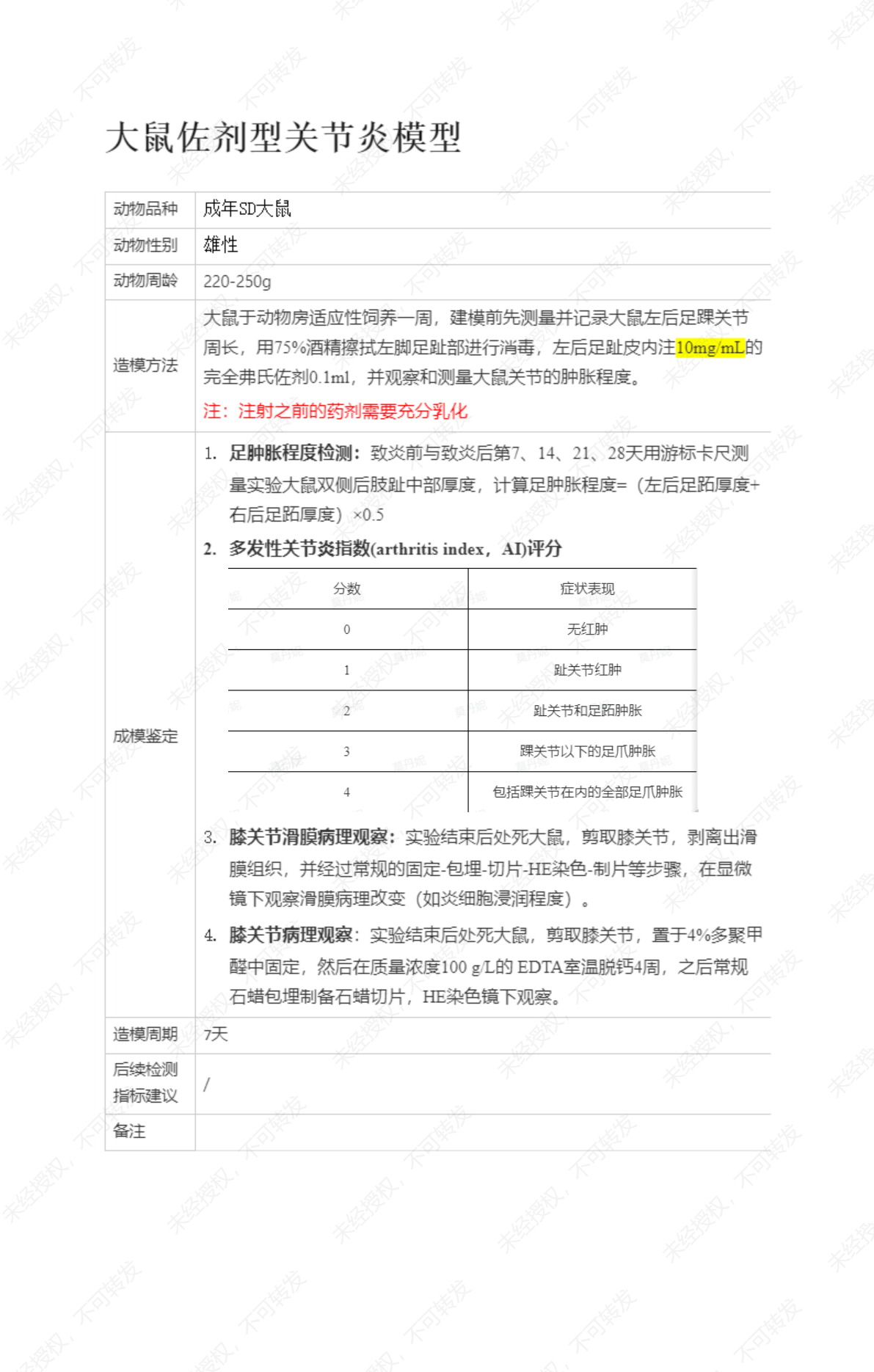 大鼠佐剂性关节炎模型
