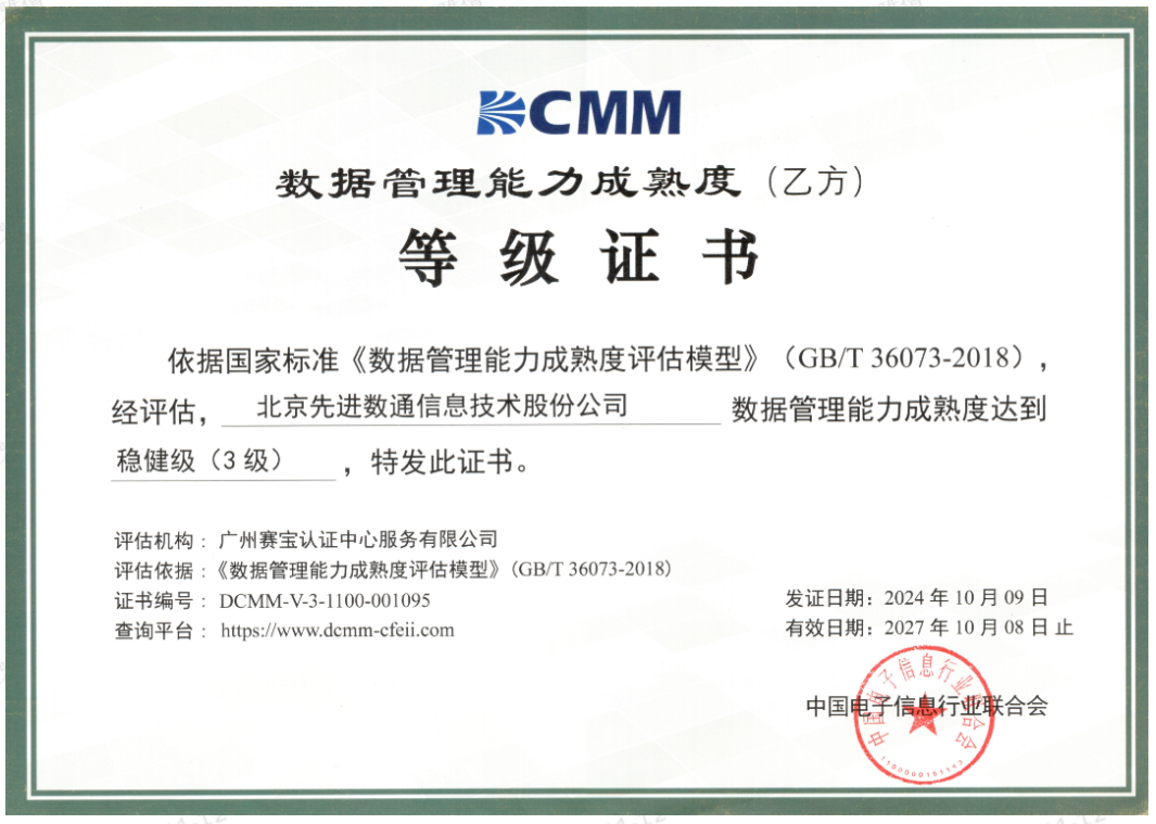 近期,中国电子信息行业联合会公布了最新一批顺利获得数据管理能力成熟度(DCMM)贯标等级认证的企业名单。一竞技官网成功取得数据管理能力成熟度稳健级(三级)认证。这一认证的取得,标志着一竞技官网在数据治理体系构建和数据管理与应用能力方面,已经达到了国家权威组织认可的标准。这不仅是对一竞技官网在数据管理领域专业能力的肯定,也是对其在有助于数字化转型服务和数据驱动决策方面所做努力的认可。
