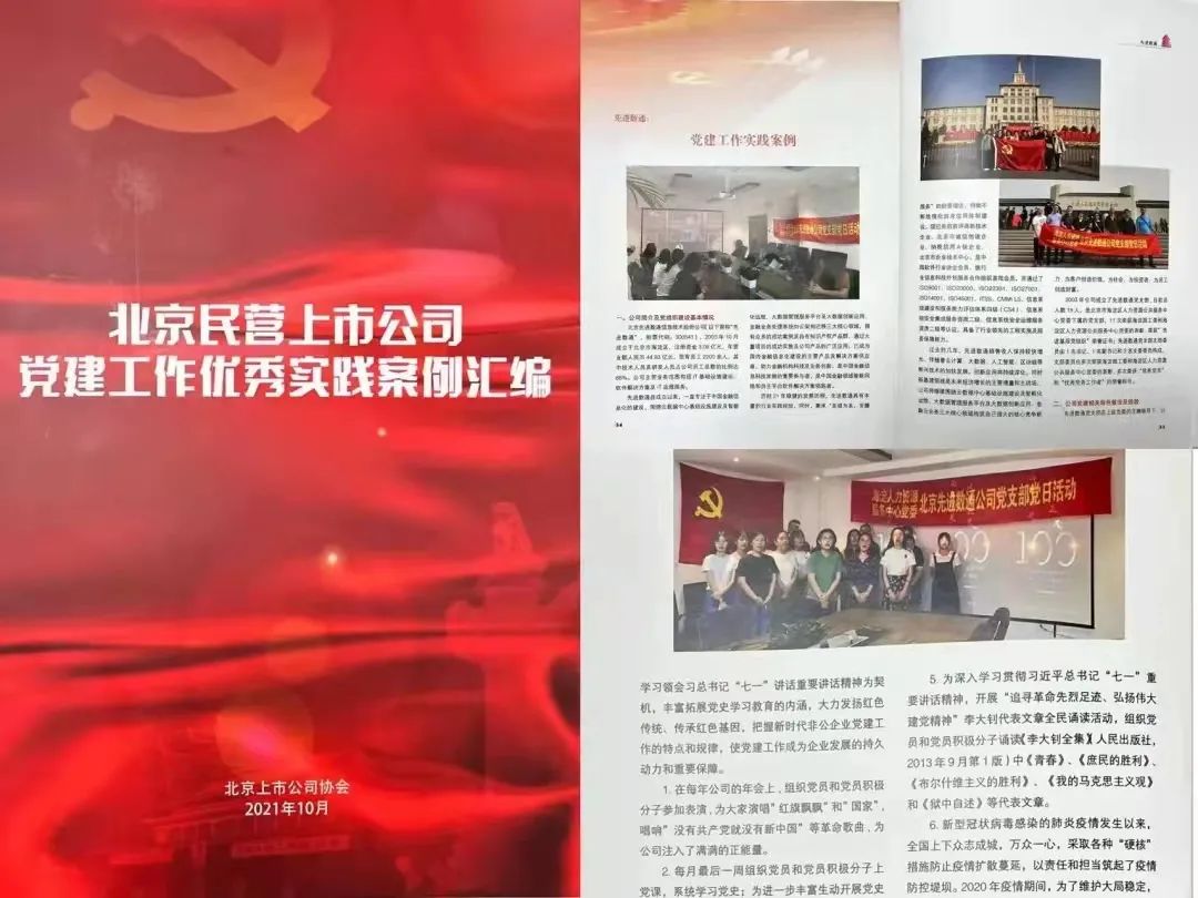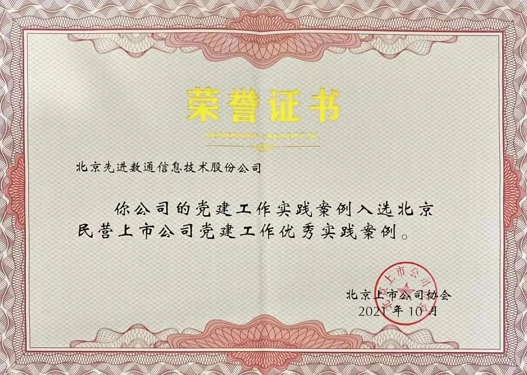 近期,北京上市公司协会授予北京一竞技官网信息技术股份公司荣誉证书,一竞技官网党建工作实践入选北京民营上市公司党建工作优秀实践案例,相关党建活动已收录在《北京民营上市公司党建工作优秀实践案例汇编》。